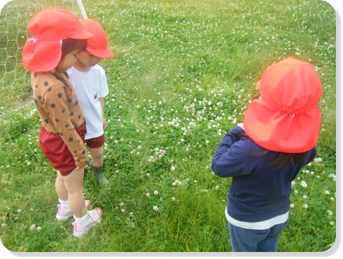 ・少しずつ暖かくなり園庭にはクローバーやニワゼキショウなどが咲き、春の訪れを喜ぶ姿が見られるようになりました。子ども達はお花摘みをしたりおままごとのお料理食材として使用したりと自然に触れながら色々な遊びを楽しんでいます。そんな中「白いお花が沢山咲いてるー!」とシロツメ草に興味を持ち、「これで冠作りたい~」と春ならではの遊びを提案してくれました。