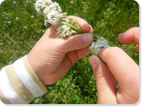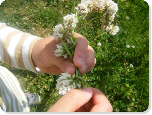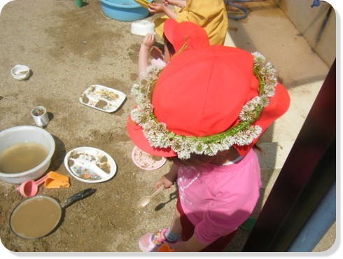 ・最後はしっかりと縛ります。出来上がるとおままごとに活用している姿も。役を決めて「お母さん」と可愛く冠を被っていました。他にも冠をつけて嬉しそうに「写真とって~」と見せにきてくれる子どももいました。冠が終わると「次は指輪作るよ」「時計も出来るよ」と色々な案が出てきました。季節の自然に触れながら自分たちで色々な遊びを考える姿は、大人には中々ない発想で、すごいなと実感しました。