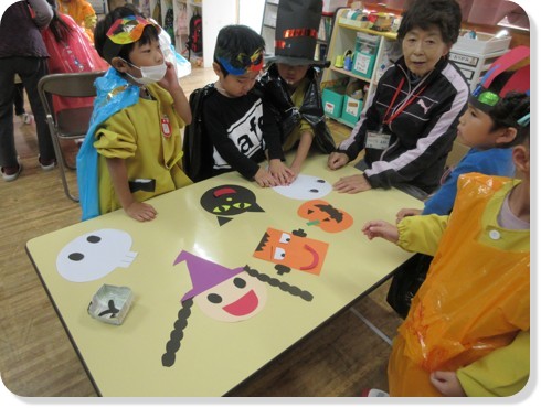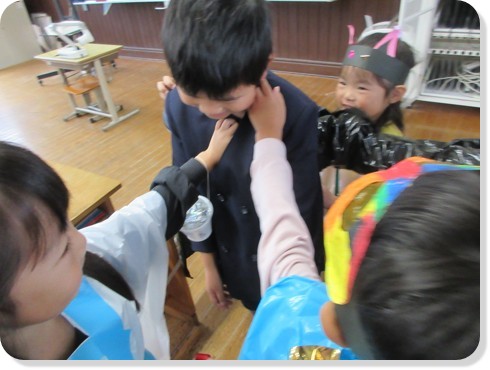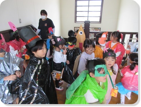 愛美会さん(地域の方)にもきてもらいました。ハロウィンゲームをしたり、園児が作った『おかしのくに』や『おばけやしき』に招待したりしましたよ。嬉しかったね!そして楽しかったね!