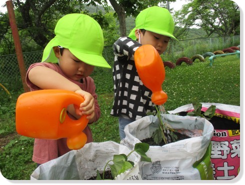 5月、肥料袋を使ってサツマイモの苗を植えました。