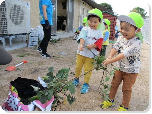 みんなで育てたサツマイモで、芋ほりやクッキング、焼き芋を楽しんだりするだけでなく、お芋のツルで電車ごっこや綱引きをして遊び楽しむことができます。また、お芋のツルは、炒めたり、煮たりして食べることもできるので、お家で料理してみてくださいね。