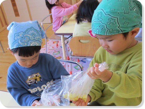 ビニール袋にふかしたお芋を入れて、手でモミモミ!ムニュムニュ!「気持ちいい~!」