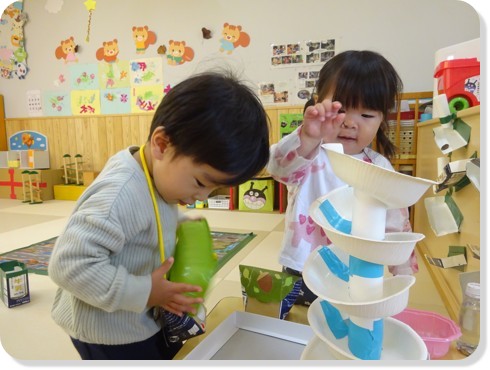 ドングリをテーブルの上やいろいろな玩具の坂道で転がして遊ぶ姿がありました。どこ(何)で転がしたら面白いかを感じながら、ドングリが転がっていく様子を見ていました。いろいろな玩具でドングリを転がすことを楽しんでいました。
