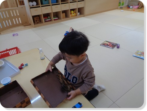 たくさんのドングリが入った箱を持ち、箱を傾けるとドングリが流れ、“じゃらじゃらじゃらー”と音がすることに気づき、何度もドングリの入った箱を右へ左へと傾け、ドングリが流れていく様子を見たり、音を聴いたりすることを楽しんでいました。