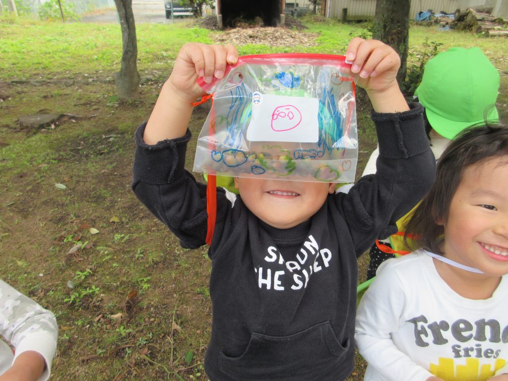 ・保育園まで持って帰ってきて暫く遊んでいると、園庭に落ちていた葉っぱ等を集めて顔を書いていました。