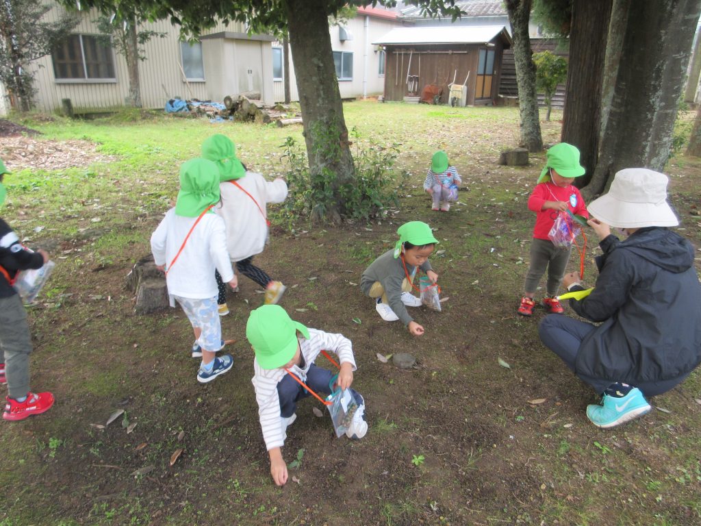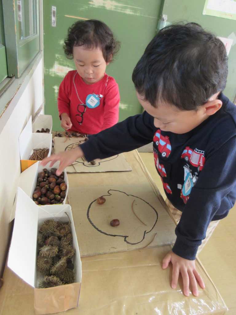 ・秋は、散歩や遠足に行って、木の実やドングリ、葉っぱなどたくさんの自然を見つけて拾って遊びました。