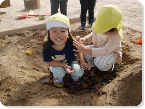 散歩や遠足で拾った葉っぱだけでは足りず、毎日コツコツ園庭に落ちている葉っぱや、園周辺に出かけてたくさんの落ち葉を集めました。砂場に穴を掘り温泉作りが始まりました。