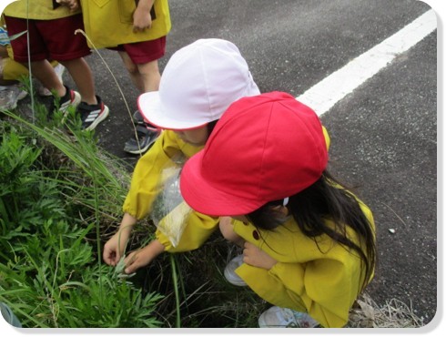 年長児と年少児がペアになって、よもぎをとりました。とったものの匂いをかいで、「いいにおい。これだよ。」と二人で話しながらとっていました。