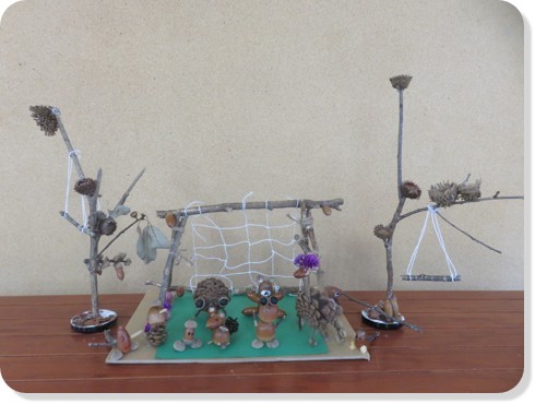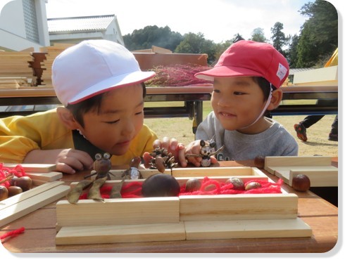 ・作ったドングリ人形を使ってお話の場を、カプラ、自然物、毛糸などを使って作ります。