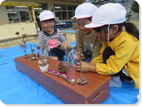 ・自然物(ドングリ・マツボックリ・カヤノミ・ドングリ帽子・千日紅など)を使って動物などに見立てたドングリ人形を作ります。ドングリなどをくっつける際は、ボンドまたはホットボンドを使用します。
